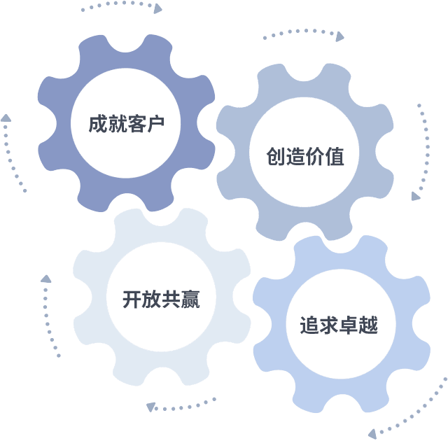 成就客户是一切决策的出发点,,创造价值是衡量所有工作的标准,,,,追求卓越是我们做事做人的态度,,开放共赢是我们的格局也是最终的结果。。。。价值观的齿轮环环相扣,,,推动着组织里的每个人不断向前。。。。