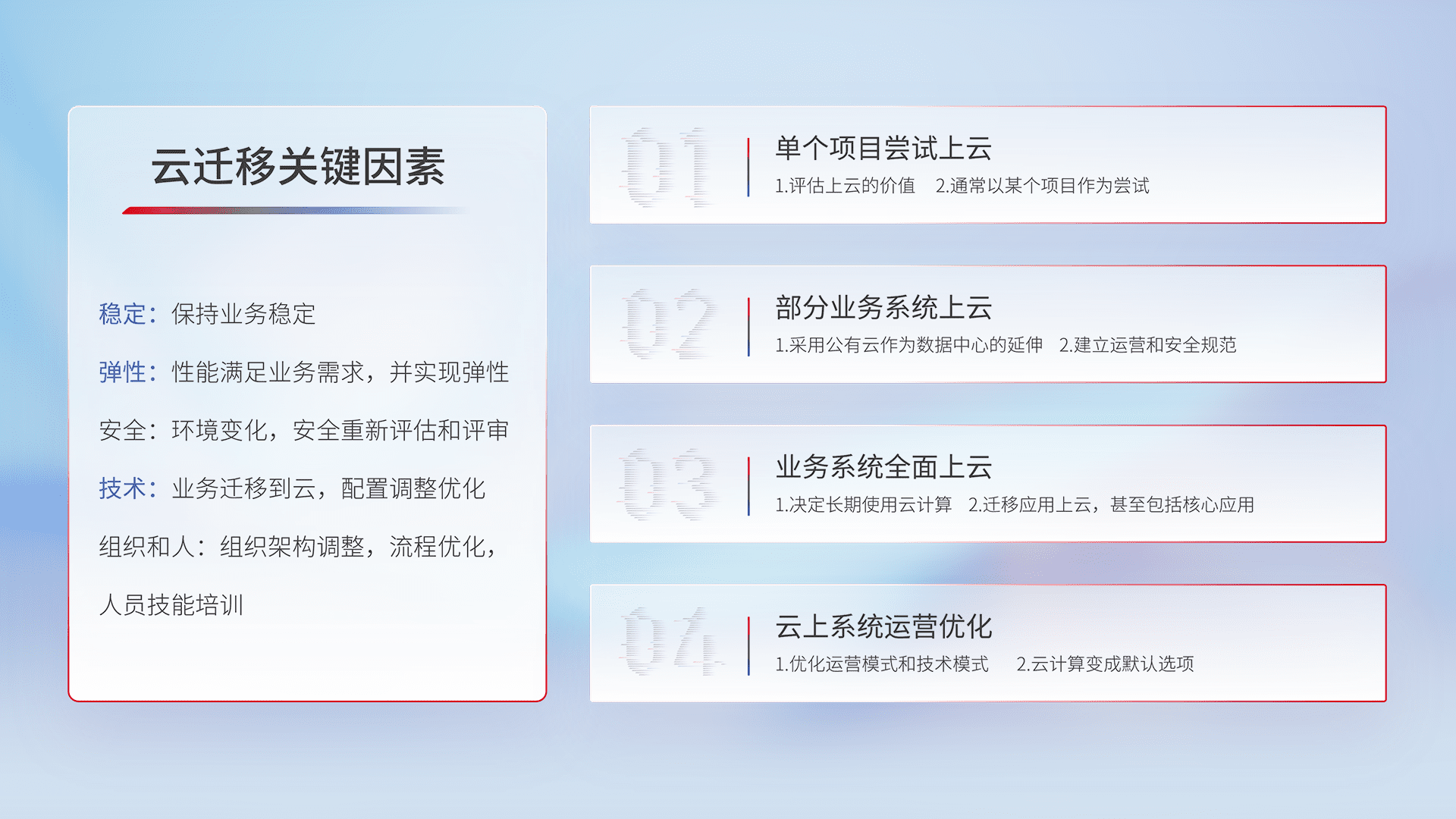 结合实际业务,,从规划设计、、、、云平台选型、、、云原生改造、、、、数据迁移、、、集成交付,,,迁移全过程为客户识别最佳上云路径,,,,做好风险识别管理,,,,设计网络架构、、、身份权限、、、安全审计合规、、、、操作审计、、、日志审计、、、监控告警策略、、、、多站点容灾设计等,,,,对云上基础设施进行整体规划,,,,提升IT治理水平,,,,以满足弹性、、、高可用、、、高性能的需求。。